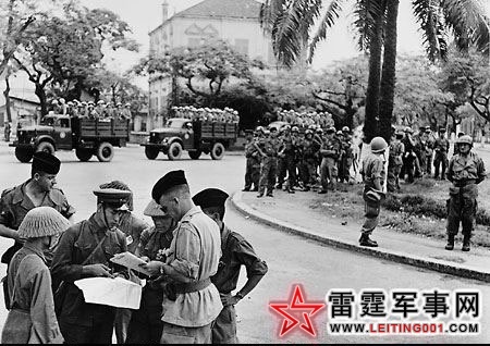 法国军官正和越南人民军参谋人员商谈从法控区撤军的事宜,奠边府战役使法军损失超过35000人,至此法国自1959年起对越南的殖民统治宣告结束。根据和越方达成的协定,法军可以携带武器离开越南。(1954.8)