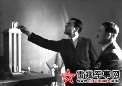 1937年,施佩尔(左)向希特勒展示巴黎世博会德国馆模型。