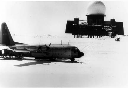 美国纽约国警队第109战术空运大队带滑撬的C-130D停在格林兰雷达站旁
